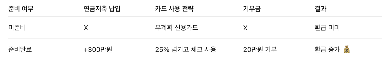 - 반대로 25% 미달이라면 → 신용카드로 몰아쓰기 전략