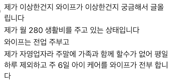 주 6일 근무를 하는 남편이고 와이프가 아이케어를 전담한다고 합니다.