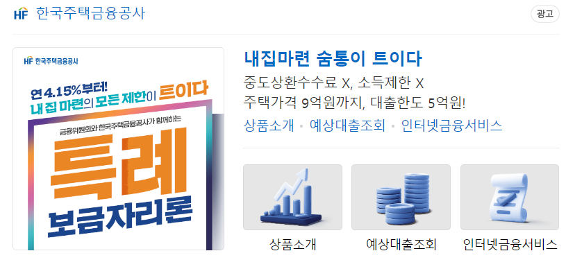 | 특례보금자리론 | - 일반형: 4.25-4.55% (주택가격6억이상 or 소득1억이상인경우) - 우대형: 4.15%-4.45% (주택가격 6억이하 & 소득 1억이하) |