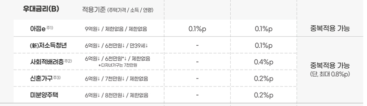 아낌e, 저소득청년, 사회적배려층, 신혼가구, 미분양주택에 따라 최대 0.8%까지 우대금리 가능 최저금리 시 일반형 4.15%, 우대형 3.25% https://www.hf.go.kr/ko/sub01/sub01_01_05.do |
